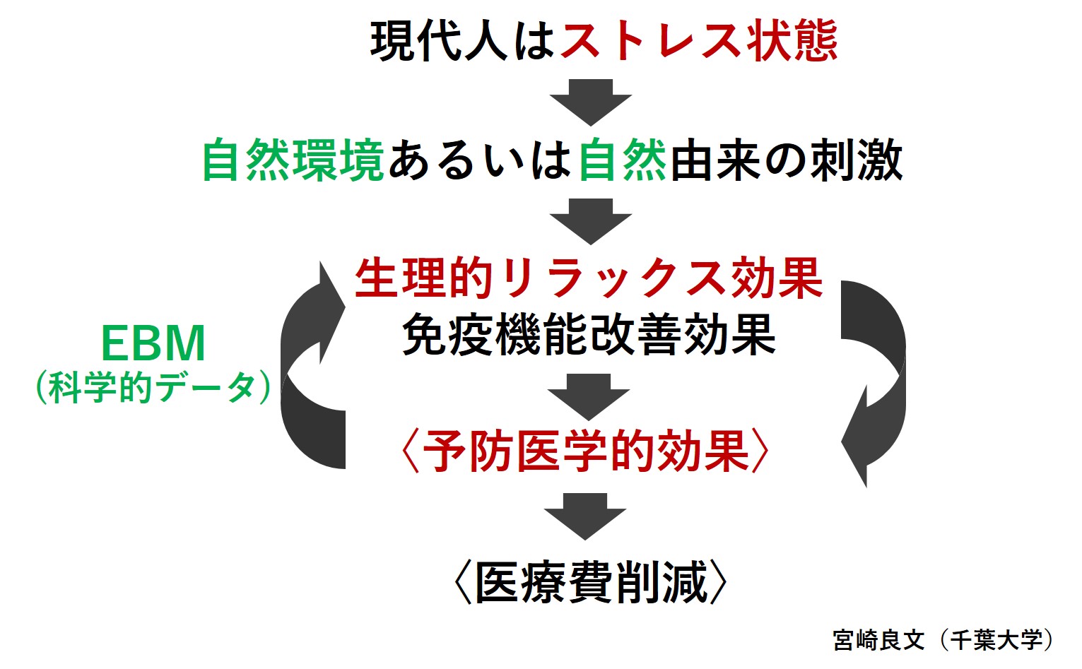 自然環境あるいは自然由来の刺激によって生理的にリラックスし、低下している免疫機能が改善するという「予防医学的効果」が、自然セラピーの基本概念です。自然セラピー研究を進めることによって、将来的には、日本を含めた世界各国において問題となっている医療費削減、ならびに人々のQOL(生活の質)の向上に貢献します。