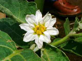 ‘キンチャック’という品種のナスです。成熟した果実が緑色の品種で、アントシアニン合成系が停止しているため、茎も葉も紫色になっていません。