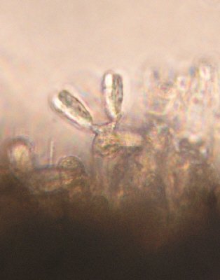 ↑白粉状の子実層を顕微鏡で観察すると、こんな感じに見えます。矢印のところに見えるのが菌の担子器と担子胞子です。