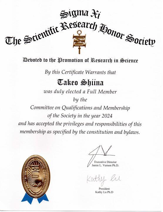 【受賞・認定】椎名武夫特任研究員が米国科学研究名誉協会(Sigma Xi)の正会員に認定!!